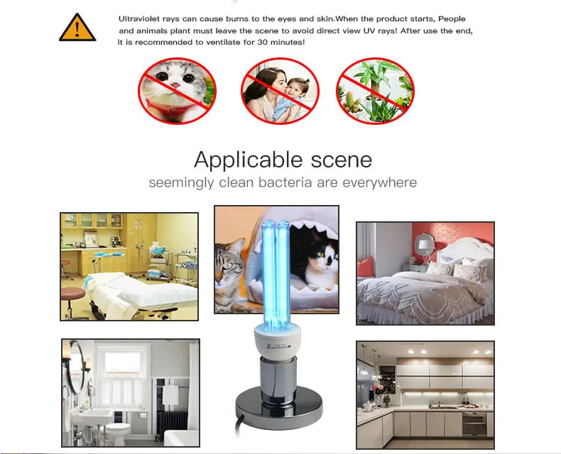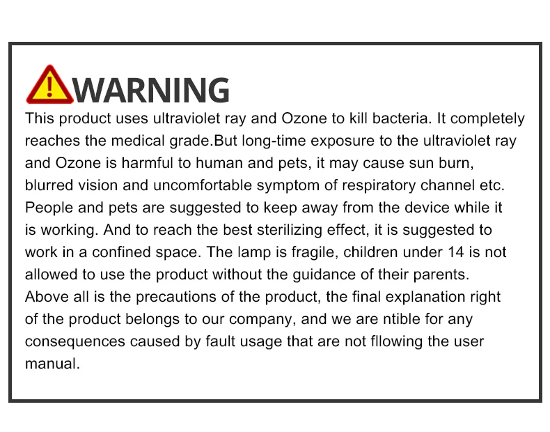 UVC Ray is harmful to eyes and skin, don’t look at the lamp when it ‘s light up. People/pet/plants can`t expose to the light . After use, because the lamp killed a lot of bacteria in the room, please open the windows and doors, allow the room to ventilate 15 minutes then enter.