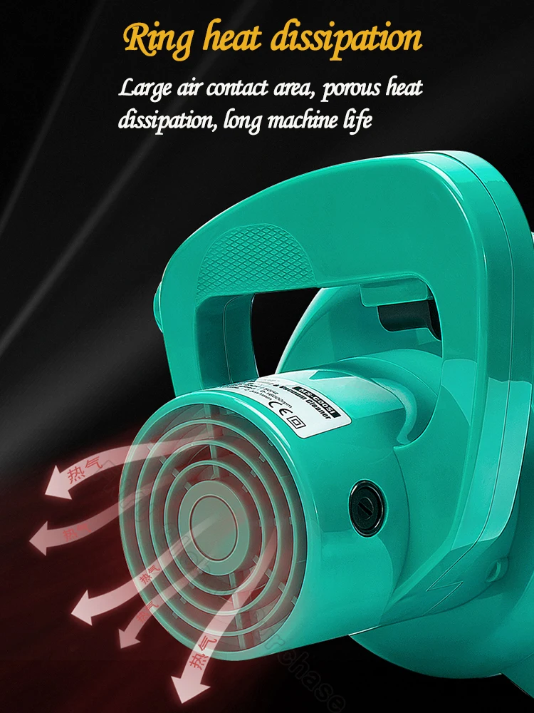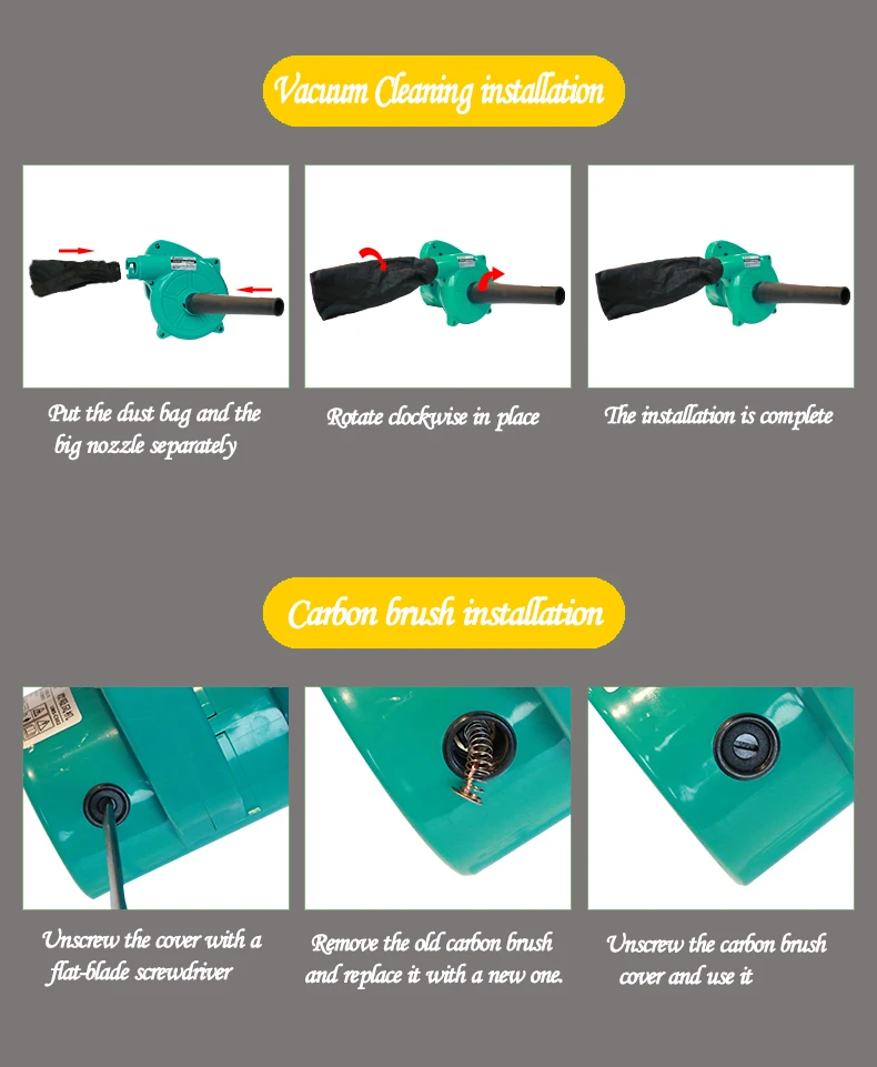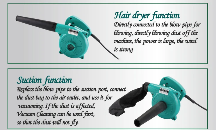 Hair dryer function Directly connected to the blow pipe for blowing, directly blowing dust off the machine, the power is large, the wind is strong Suction function Replace the blow pipe to the suction port, connect the dust bag to the air outlet, and use it for vacuuming. If the dust is affected,Vacuum Cleaning can be used first, so that the dust will not fly.