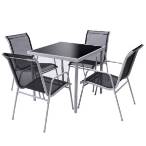 This is our new outdoor patio furniture set which includes 4 chairs and 1 square table. Made from high quality steel construction ,is very durable and sturdy.The textilene fabric surface chairs is very comfortable and breathable ,give you a comfortable seating experience.Elegantly and lightweight designed, is easy to move and transport.Perfect for outdoor and indoor , such as patios, balconies, terrace, apartment, breakfast nooks, beach coastal houses and much more.